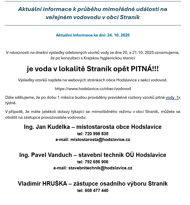 Aktuální informace k pitné vodě ve Straníku 24.10.2025 Vystavil: Lenka Burianová Sdílet Sdílet Klikněte pro zkopírování URL Facebook Aktuální informace ke dni: 24. 10. 2025V návaznosti na dnešní výsledky odebraných vzorků vody ze dne 20. a 21.10. 2025 oznamujeme, že po konzultaci s Krajskou hygienickou stanicí je voda v lokalitě Straník opět PITNÁ!!!