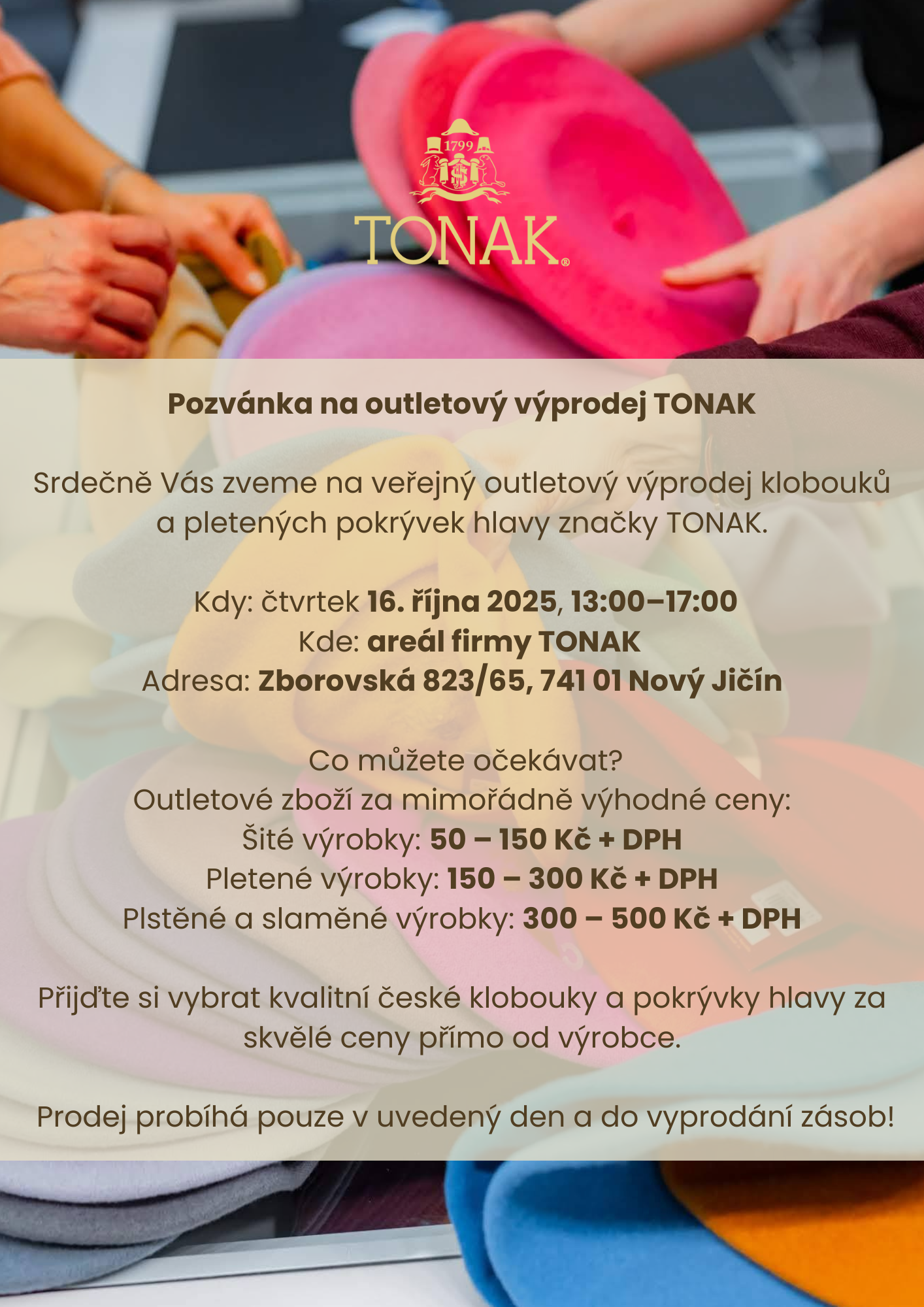 Outletový výprodej TONAK 7.10.2025 Vystavil: Jana Horáková Sdílet Sdílet Klikněte pro zkopírování URL Facebook Firma TONAK zve širokou veřejnost na outletový výprodej klobouků a pletených pokrývek hlavy. Přílohy Výprodej veřejnost (1).pdf PDF, 488.62 KB Stáhnout