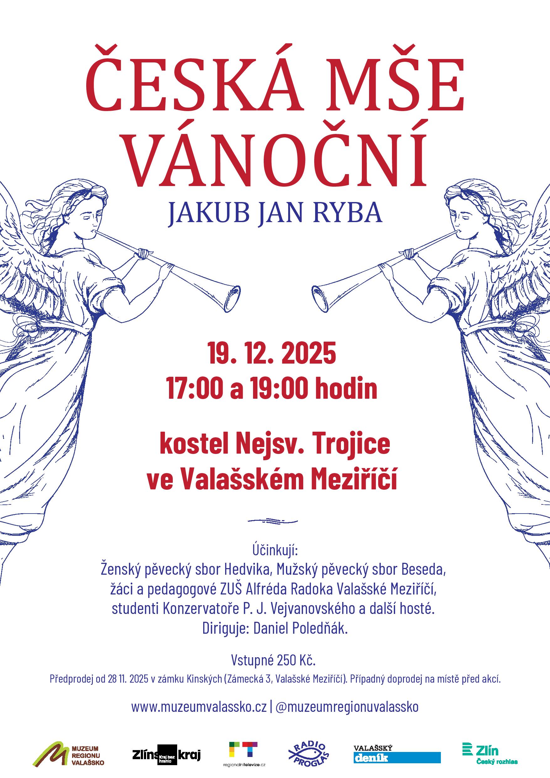 Návštěvnická sezona kostela Nejsv. Trojice ve Valašském Meziříčí už sice pro letošní rok skončila, v prosinci přesto ještě otevřeme brány veřejnosti pro dvojici vánočních koncertů. Jedním z nich je i tradiční Česká mše vánoční Jakuba Jana Ryby, která se uskuteční v pátek 19. prosince od 17:00 a 19:00 hodin. Přijďte si vychutnat úžasný hudební zážitek v jedinečném prostředí památkově chráněného objektu okořeněný kouzelnou atmosférou blížících se Vánoc. Předprodej vstupenek probíhá na zámku Kinských ve Valašském Meziříčí (Zámecká3). Více na https://www.muzeumvalassko.cz/akce-a-vystavy/ceske-mse-vanocni