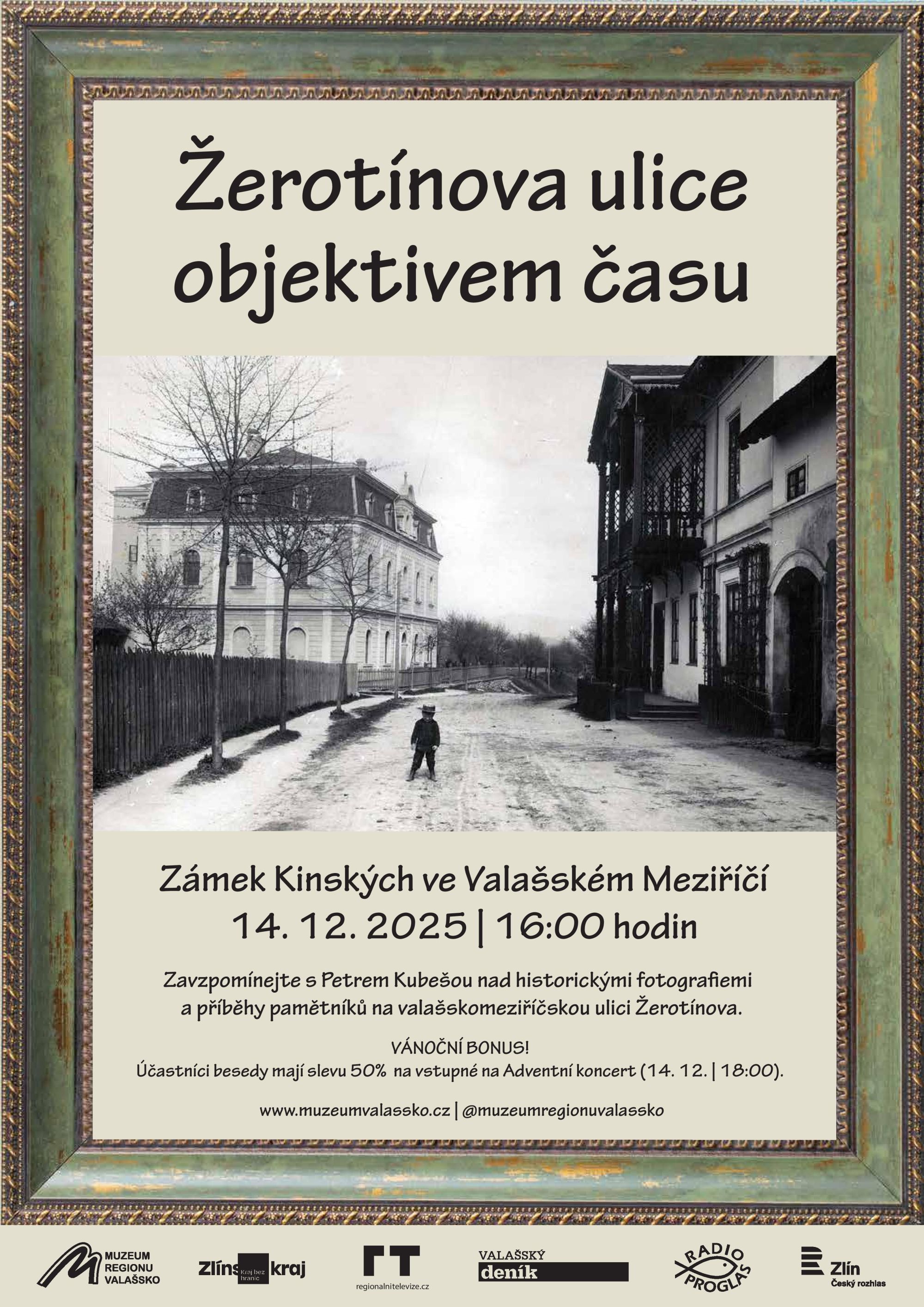 Na další výlet zpět v čase do historických ulic města pozve čtvrtá letošní beseda z cyklu Valašské Meziříčí objektivem času. Na zámku Kinských si v neděli 14. prosince od 16 hodin připomeneme historickou podobu ulice Žerotínova. Účastníci mohou využít vánoční bonus v podobě 50 procentní slevy na navazující Adventní koncert. Více na https://www.muzeumvalassko.cz/akce-a-vystavy/zerotinova-ulice-objektivem-casu