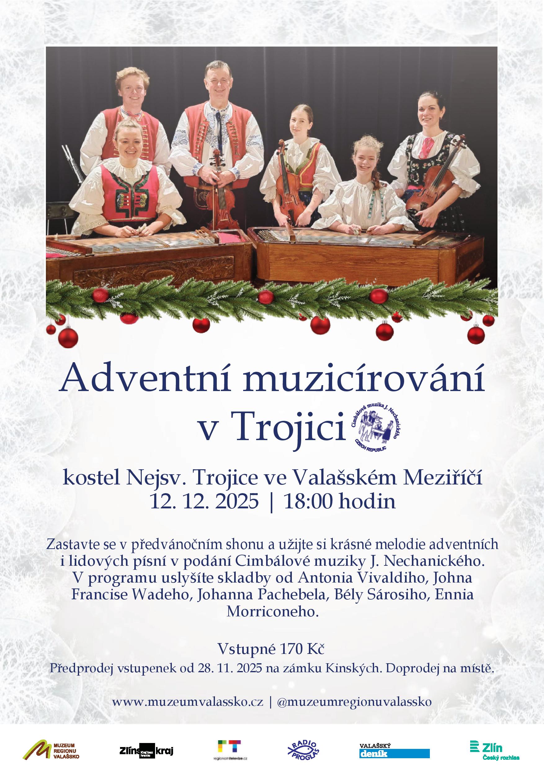 Nejen tradiční Česká mše vánoční v podání pěveckého sboru Hedvika a jeho hostů, ale i lidové a adventní melodie na notéčku Cimbálové muziky J. Nechanického zazní během nadcházejícího adventního období v kostele Nejsvětější Trojice ve Valašském Meziříčí. Koncert s názvem Adventní muzicirování v Trojici proběhne v pátek 12. prosince od 18:00 hodin. Předprodej vstupenek probíhá na zámku Kinských ve Valašském Meziříčí (Zámecká3). Více na https://www.muzeumvalassko.cz/akce-a-vystavy/adventni-muzicirovani-v-trojici