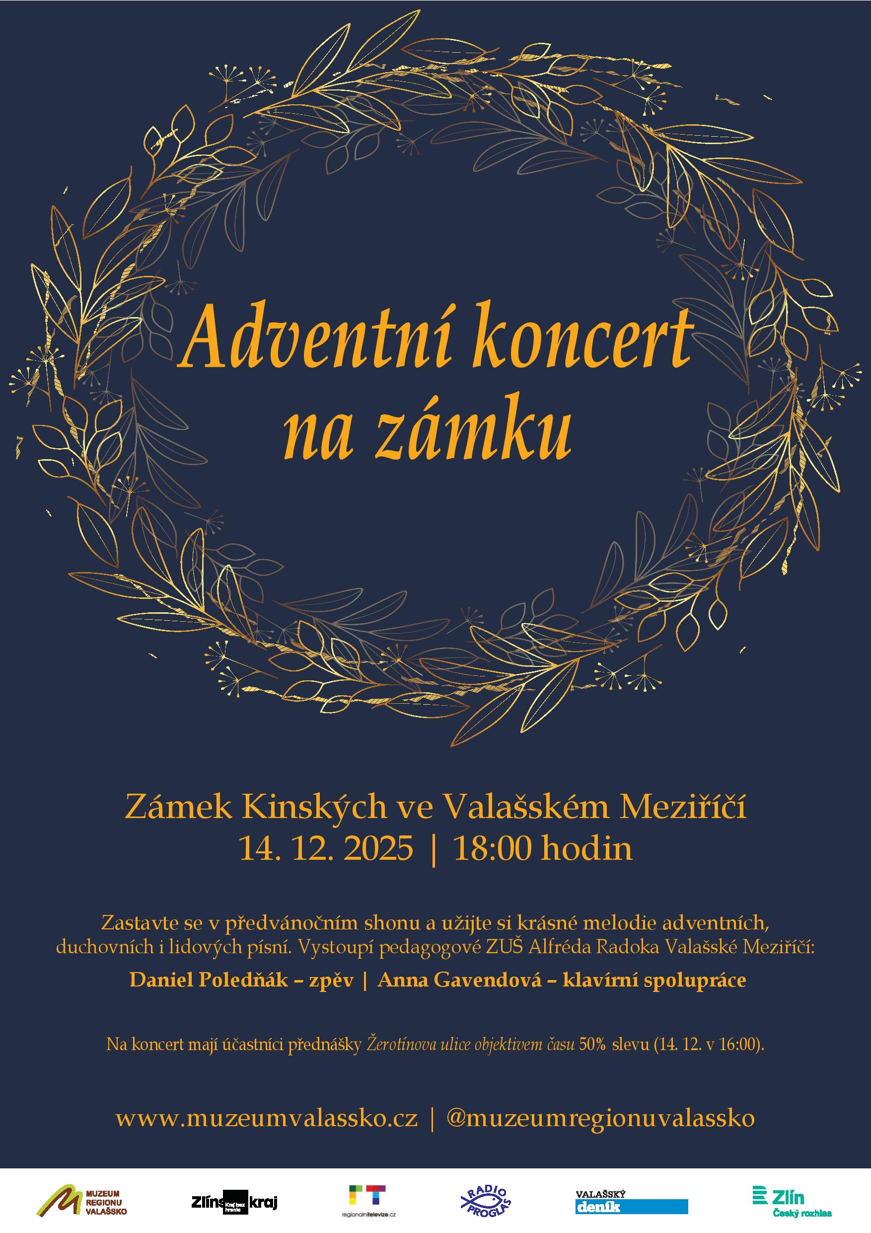 Spojení výjimečného hudebního zážitku a kouzelné atmosféry blížících se Vánoc nabídne adventní koncert pedagogů ZUŠ Alfréda Radoka ve Valašském Meziříčí Daniela Poledňáka a Anny Gavendové, který se uskuteční v neděli 14. prosince na zámku Kinských ve Valašském Meziříčí. Začátek je v 18 hodin. Účastníci přednášky Žerotínova ulice objektivem času, která bude koncertu od 16:00 hodin předcházet, mají 50% slevu na vstupné. Více na https://www.muzeumvalassko.cz/akce-a-vystavy/adventni-koncert-na-zamku