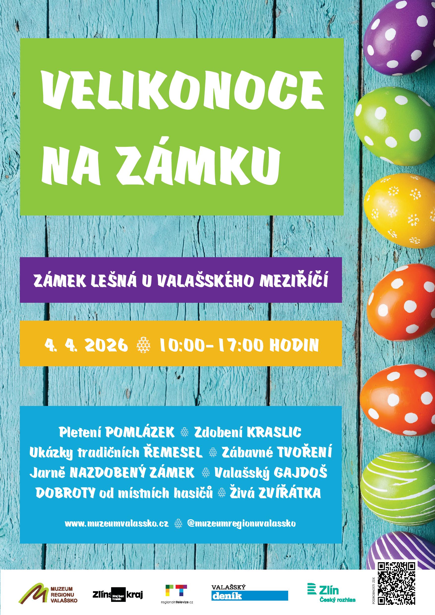Zámek Lešná u Valašského Meziříčí ožije v sobotu 4. dubna pravou velikonoční atmosférou. Zájemci si budou moci uplést vlastní tatar, namalovat kraslici, vytvořit výrobek z kukuřičného šustí nebo se nechat zasvětit do tajů tradičních řemesel. Ať už prostřednictvím řezbářské dílny s výrobou lodiček a píšťalek či při ukázkách práce s ovčí vlnou. Součástí nabídky budou i komentované prohlídky jarně vyzdobeného zámku a chybět nebudou ani živá zvířátka z farmy chovatele Vojtěcha Molka. O hudební doprovod se postará známý valašský gajdoš Petr Sovják. Místní hasiči a další prodejci připraví nejrůznější dobroty pro děti i dospělé.