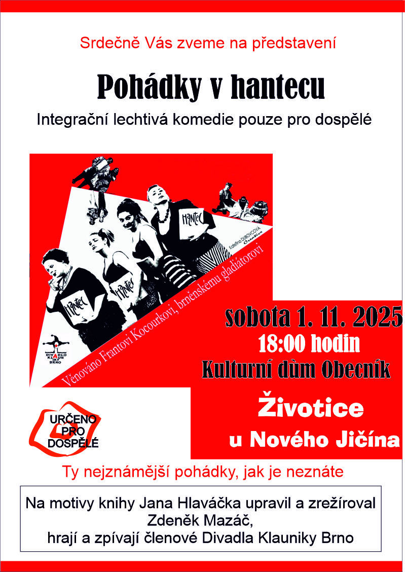 Pozvánka na divadlo 15.10.2025 Vystavil: Jana Horáková Sdílet Sdílet Klikněte pro zkopírování URL Facebook Srdečně vás zveme na představení Pohádky v hantecu.