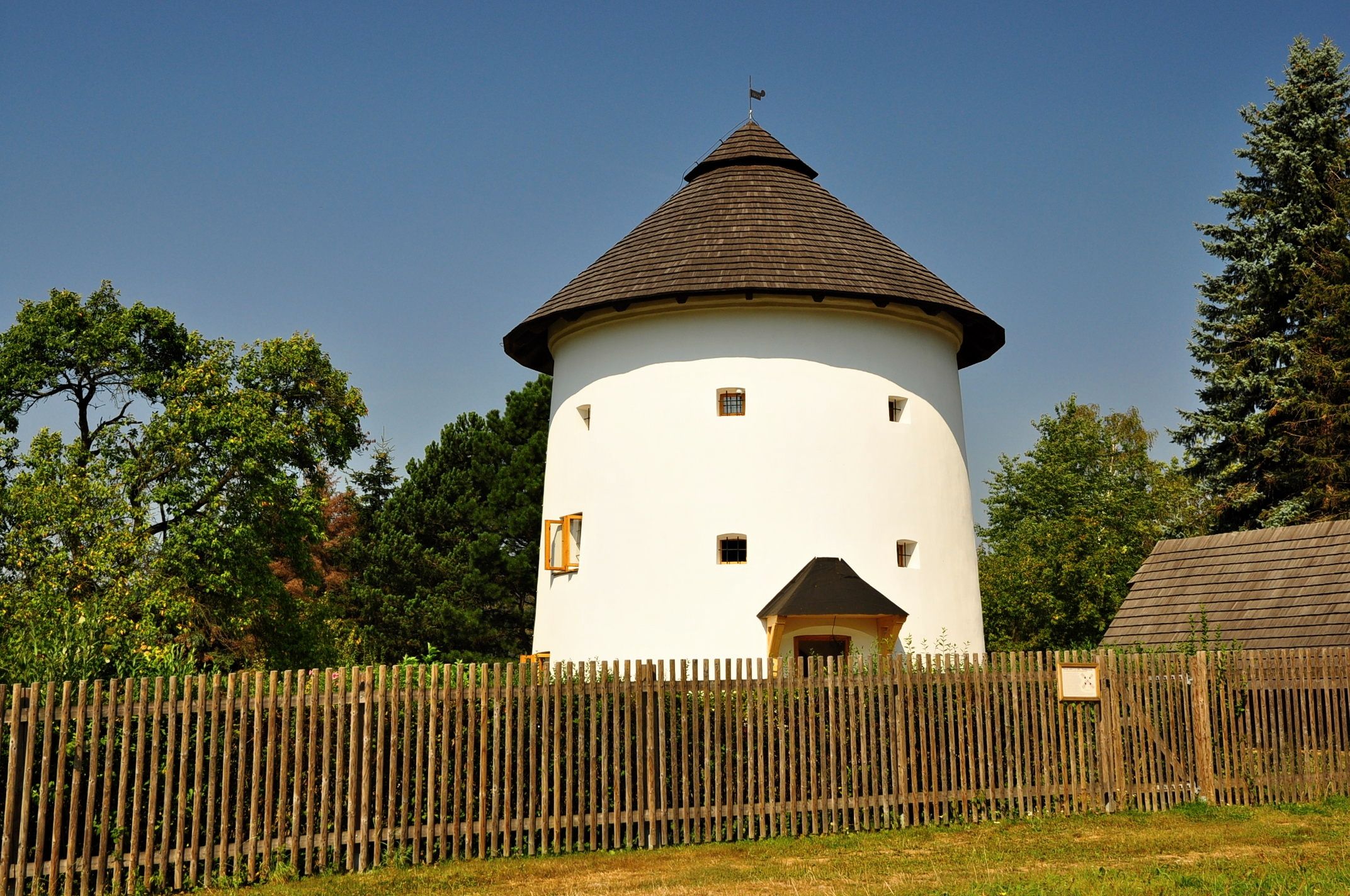 Větrný mlýn je tvořen válcovou budovou s obvodem 26 m a průměrem 9,2 m, která je vysoká po okap 8 m. Na ní sedí nízká kuželovitá střecha, pokrytá šindelem.
